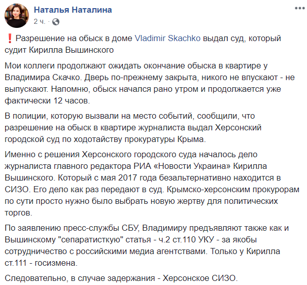 Обыски в квартире известного киевского журналиста Владимира Скачко, которые с утра 5 марта проводит СБУ, санкционировал Херсонский суд по требованию прокуратуры Крыма, а сами обыски еще продолжаются.