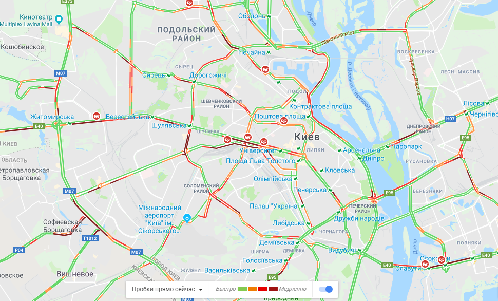 Кроме того, местами затруднено движение на Большой Окружной дороге, на проспекте Победы (от станции метро "Шулявская" до "Житомирской"), улице Соборной.