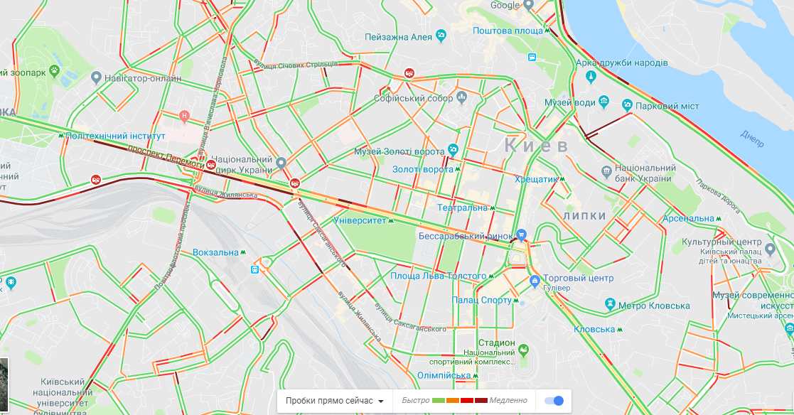 Утром в среду, 6 марта, в Киеве образовались серьезные пробки. Особенно затруднен проезд в центре города. Об этом свидетельствуют данные сервиса Google Maps.