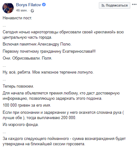 "...Наркоторговцы обрисовали своей "рекламой" всю центральную часть города. Включая памятник Александру Полю. Первому почетному гражданину Екатеринослава!!! Они. Обрисовывали. Поля", - возмущается городской голова.