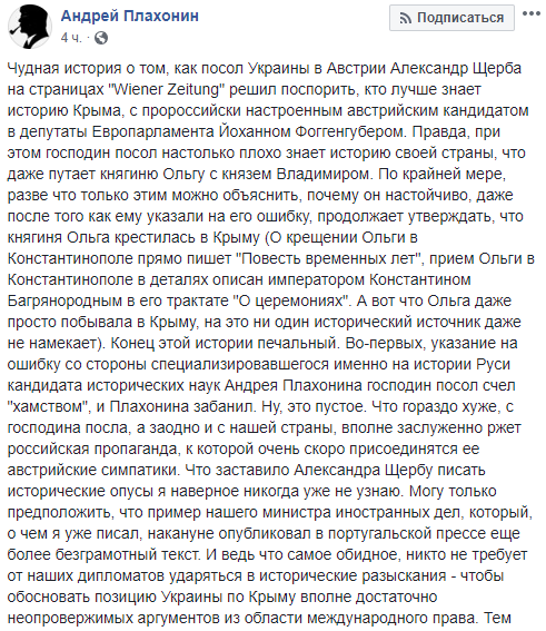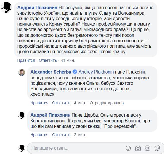 "О крещении Ольги в Константинополе прямо пишет "Повесть временных лет", прием Ольги в Константинополе в деталях описан императором Константином Багрянородным в его трактате "О церемониях". А вот что Ольга даже просто побывала в Крыму, на это ни один исторический источник даже не намекает. Конец этой истории печальный. Во-первых, указание на ошибку со стороны специализировавшегося именно на истории Руси кандидата исторических наук Андрея Плахонина господин посол счел "хамством", и Плахонина забанил. Ну, это пустое. Что гораздо хуже, с господина посла, а заодно и с нашей страны, вполне заслуженно ржет российская пропаганда, к которой очень скоро присоединятся ее австрийские симпатики", - сделал выводы Андрей Плахонин.