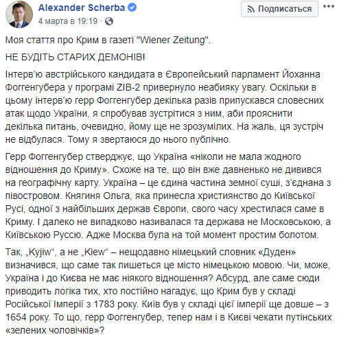 Посол Украины в Австрии Александр Щерба решил вступить в полемику с пророссийски настроенным австрийским кандидатом в Европарламент Йоханном Фоггенгубером, который заявил, что "Украина никогда не имела отношения к Крыму". Об этом он сказал в эфире австрийского телеканала ORF, в программе ZIB-2.