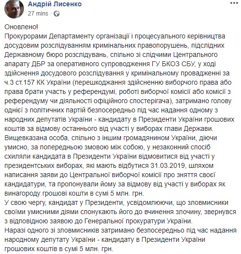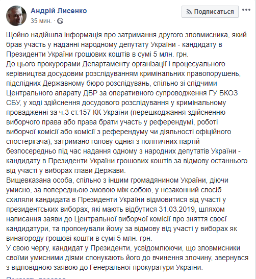 "До этого прокурорами Департамента организации и процессуального руководства досудебным расследованием уголовных правонарушений, подследственных Государственном бюро расследований, совместно со следователями Центрального аппарата ГБР при оперативном сопровождении ГУ БКОЗ СБУ, в ходе осуществления досудебного расследования в уголовном производстве по ч.3 ст.157 УК Украины (препятствование осуществлению избирательного права или права участвовать в референдуме, работе избирательной комиссии или комиссии по референдуму или деятельности официального наблюдателя), задержан глава одной из политических партий непосредственно во время предоставления одному из народных депутатов Украины - кандидату в Президенты Украины денежных средств за отказ последнего от участия в выборах главы Государства", - пишет Лысенко.
