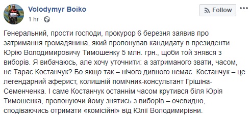 "Костанчук - легендарный аферист, бывший помощник-консультант Гришина-Семенченка. И именно он последнее время вертелся возле Юрия Тимошенко. Предлагая ему сняться с выборов, по всей видимости надеялся получить "комиссионные" от Юлии Владимировны", - пишет Бойко.