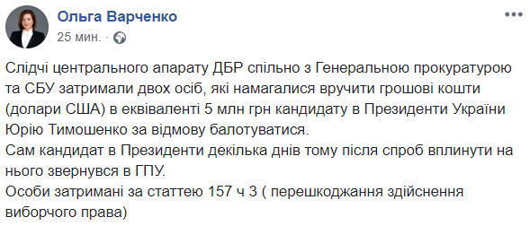 "Следователи центрального аппарата ГБР совместно с Генеральной прокуратурой и СБУ задержали двух человек, которые пытались вручить денежные средства (доллары США) в эквиваленте 5 млн грн кандидату в президенты Украины Юрию Тимошенко за отказ баллотироваться", - сообщила она.