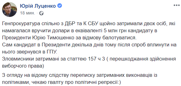 "Генпрокуратура совместно с ГБР и СБУ задержала двух человек, которые пытались подкупить кандидата в президенты Юрия Тимошенко за его отказ от борьбы, - заявил главный прокурор.