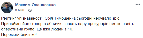 Рейтинг узнаваемости Юрия Тимошенко сегодня небывало возрос. По крайней мере его теперь в лицо знают пара прокуроров и может даже оперативная группа. Это уже человек 10. Победа близка", - пишет журналист Максим Опанасенко.