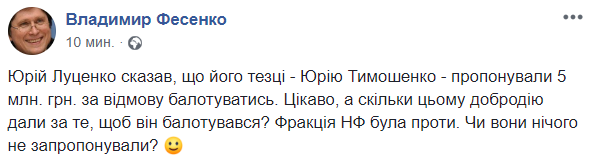 "Юрий Луценко сказал, что его тезке - Юрию Тимошенко - предлагали 5 млн. грн. за отказ баллотироваться. Интересно, а сколько этому господину дали за то, чтобы он баллотировался? Фракция НФ была против. Или они ничего не предложили?", - иронизирует политолог Владимир Фесенко.