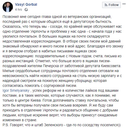 "С начала года у нас уволился почтальон. В больших ящиках на почте складируется недоставленная корреспонденция. В отборе своих писем мой давний знакомый обнаружил и много писем в мой адрес. Благодаря его звонку и я вечером отобрал в набитых письмами ящиках свою корреспонденцию: поздравительные с Новым годом, счета, письма из разных инстанций. Отметил, что больше всего в ящиках писем-поздравлений жителям Печерска от заботливой депутата Киевсовета", - написал он.