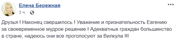"Наконец свершилось! Уважение и признательность Евгению за своевременное мудрое решение! Адекватных граждан большинство в стране, надеюсь они все проголосуют за Вилкула", – считает правозащитник Елена Бережная.
