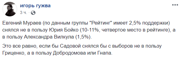 "Евгений Мураев (по данным группы "Рейтинг", имеет 2,5% поддержки) снялся не в пользу Юрия Бойко (10-11%, четвертое место в рейтинге), а в пользу Александра Вилкула (1,5%).