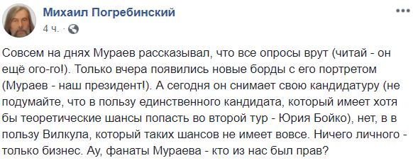 "Совсем на днях Мураев рассказывал, что все опросы врут (читай – он еще ого-го!). Только вчера появились новые борды с его портретом (Мураев – наш президент!). А сегодня он снимает свою кандидатуру – не подумайте, что в пользу единственного кандидата, который имеет хотя бы теоретические шансы попасть во второй тур, Юрия Бойко, – нет, в в пользу Вилкула, который таких шансов не имеет вовсе. Ничего личного – только бизнес. Ау, фанаты Мураева, кто из нас был прав?" – спрашивает политолог Михаил Погребинский.