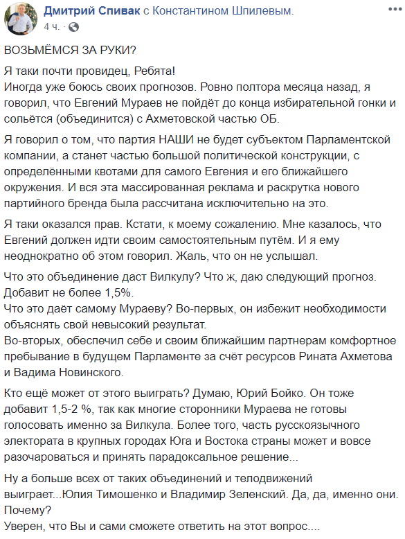 "Хорошо, когда политики находят в себе силы переступить через личные амбиции и объединиться. Снятие Евгения Мураева с выборов продемонстрировало его мудрость и политическую зрелость. В качестве бонуса он получит первый номер в списке объединенной партии и кресло премьер-министра в случае победы Вилкула на президентских выборах.