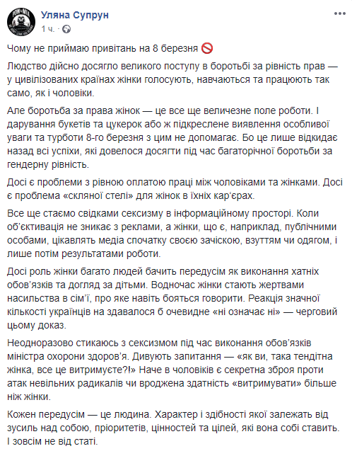Дарение букетов и конфет или особое внимание 8 марта к женщинам отбрасывает назад все успехи, которые были достигнуты во время многолетней борьбы за гендерное равенство. Об этом накануне Международного женского дня написала в Facebook глава Минздрава Ульяна Супрун.