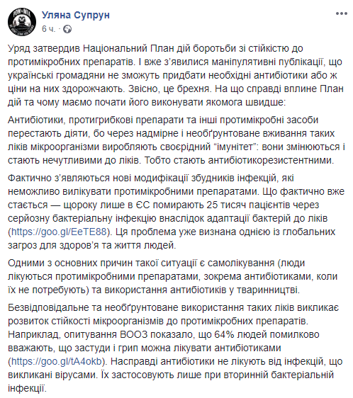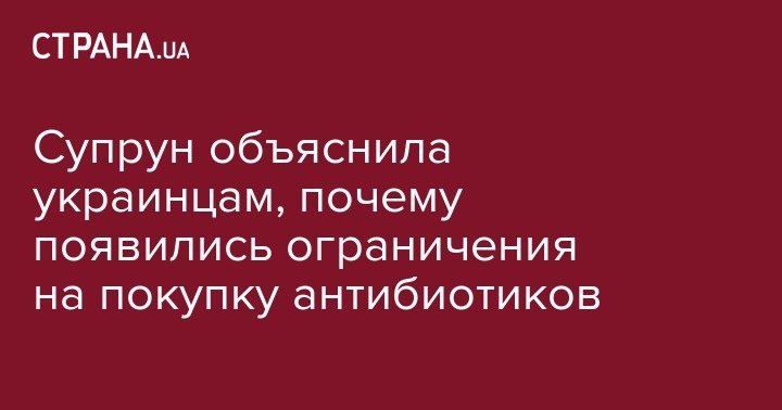 "План направлен на усиление контроля за продажей антибиотиков — то есть лекарства, которые рекомендуется принимать только по рецепту врача, будут продаваться также по рецепту врача", - пишет Супрун.