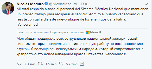 Президент Венесуэлы Николас Мадуро и лидер оппозиции Хуан Гуайдо также устроили спор в соцсети Twitter из-за отключении электроэнергии по всей стране. "Я полностью поддерживаю сотрудников Национальной системы электроснабжения, которые напряженно работают над восстановлением подачи электричества. Я восхищаюсь народом Венесуэлы, который, не унывая, сопротивляется этой новой атаке врагов Родины. Мы победим", - написал Мадуро.