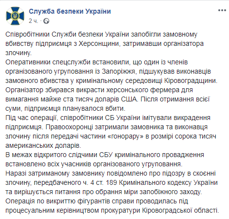 Правоохранители заранее узнали, что один из членов организованной преступной группировки из Запорожья искал в Кировоградской области человека, который мог бы совершить заказное убийство предпринимателя. Сначала херсонского фермера хотели похитить, чтобы вынудить заплатить за него "выкуп" в размере почти ста тысяч долларов, а после этого - убить мужчину.