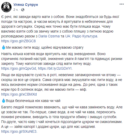 И.о. министра здравоохранения Украины Ульяна Супрун в Facebook рассказала о важности постоянного и своевременного употребления воду.