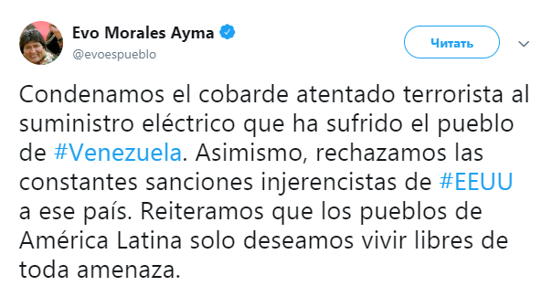 "Мы осуждаем подлую террористическую атаку на систему электроснабжения, от которой пострадали жители Венесуэлы. Точно так же мы отвергаем постоянные интервенционистские санкции в отношении этой страны. Мы повторяем, что народы Латинской Америки хотят жить только свободными от всех угроз", - заявил Моралес.