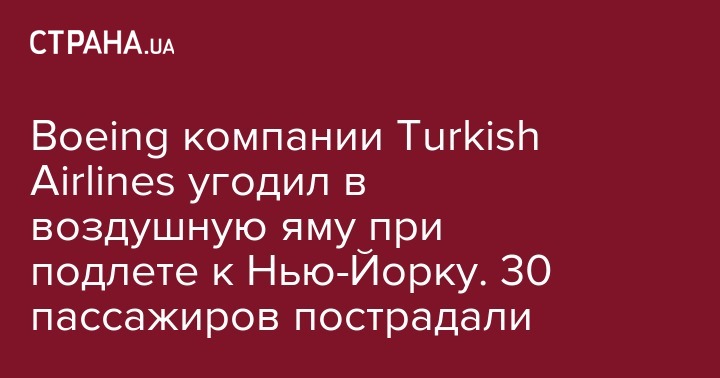 В субботу, 9 марта, во время рейса из Стамбула в Нью-Йорк, который выполняла авиакомпания Turkish Airlines, около 29 человек получили травмы из-за сильной турбулентности (лайнер угодил в так называемую воздушную яму - Прим.Ред.). Об этом сообщает телекомпания NBC со ссылкой на пожарную службу Нью-Йорка.