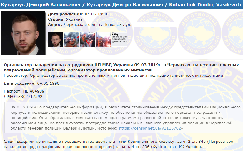 На сайте также указаны личные данные Дмитрия Кухарчука и адрес его проживания в Черкассах. "Провокатор. Организатор заказных и проплаченных митингов и шествий под националистическими лозунгами", - такую характеристику составили националисту.