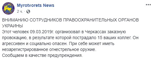 "Вниманию сотрудников правоохранительных органов. Этот человек организовал в Черкассах заказную провокацию, в результате которой пострадало 15 ваших коллег. Он агрессивен и социально опасен. При себе может иметь незарегистрированное огнестрельное оружие. Сообщаем в качестве предупреждения", - говорится на странице "Миротворца".
