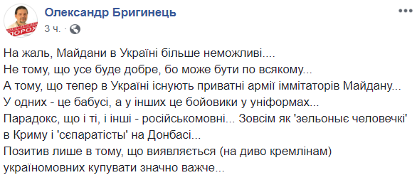 "К сожалению, Майданы в Украине больше невозможны. Не потому, что все будет хорошо, потому что может быть по-всякому. А потому, что теперь в Украине существуют частные армии имитаторов Майдана.
