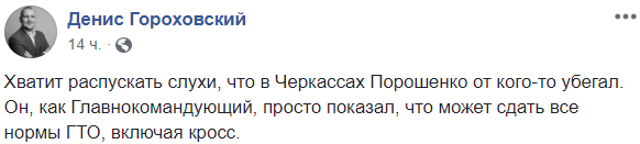 "Хватит распускать слухи, что в Черкассах Порошенко от кого-то убегал. Он, как Главнокомандующий, просто показал, что может сдать все нормы ГТО, включая кросс", – иронизирует блогер Денис Гороховский.