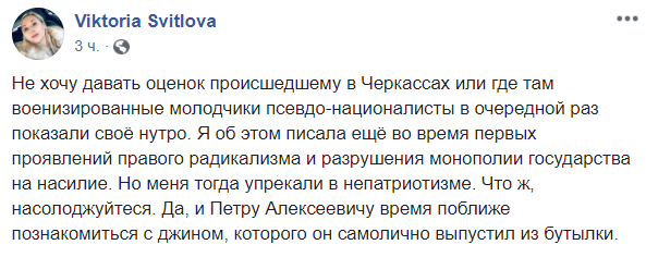 "Не хочу давать оценок происшедшему в Черкассах или где там военизированные молодчики псевдонационалисты в очередной раз показали свое нутро. Я об этом писала еще во время первых проявлений правого радикализма и разрушения монополии государства на насилие. Но меня тогда упрекали в непатриотизме. Что ж, насолоджуйтеся. Да и Петру Алексеевичу время поближе познакомиться с джинном, которого он самолично выпустил из бутылки", – пишет журналист Виктория Светлова.
