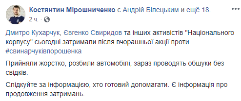 Член "Национального корпуса" Константин Мирошниченко в Facebook добавил, что полиция задержала Дмитрия Кухарчука и Евгения Свиридова.