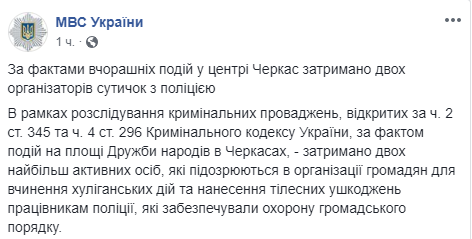 "Решается вопрос об объявлении данным гражданам подозрению в совершении уголовных преступлений предусмотренных ч.2 ст.345 (Угроза или насилие в отношении работника правоохранительного органа) и ч. 4 ст. 296 (хулиганство) Уголовного кодекса Украины", - добавили в Нацполиции.