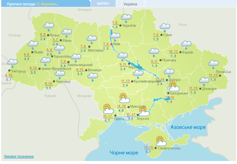 В Харькове 11 марта также ожидаются дожди днем и ночью. Столбики термометров покажут +1 … +3° ночью и +10 … +12° днем. Ветер юго-западный, 7−12 м/с.