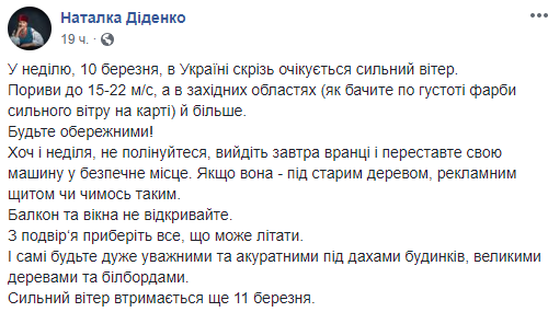 В Украину надвигается сильный ураганный ветер с порывами до 22 м/с. Об этом в Facebook сообщила народный синоптик Наталья Диденко.