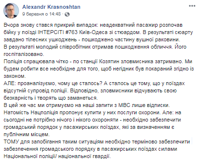 В то же время мы получаем на наши запросы из МВД только отписки. Зато Нацполиция предлагает купить у них услуги охраны. Но не нужно ничего и никого охранять - необходимо обеспечить общественный порядок в пассажирских поездах, которые по определению является публичным местом. Поэтому для предотвращения таких ситуаций необходимо срочно обеспечить охрану общественного порядка в пассажирских поездах силами Национальной полиции / национальной гвардии", - написал Александр Красноштан.