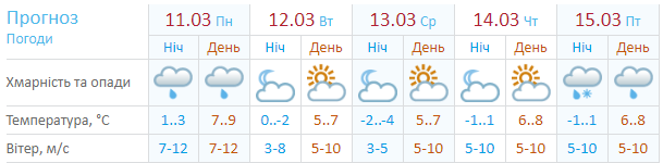 Сайт Укргидрометцентра прогнозирует, что понедельник станет самым теплым днем трудовой недели, несмотря на порывы северо-западного ветра. Термометры днем покажут до +7...+9. В первой половине дня будет срываться небольшой дождь. Со вторника по пятницу днем +5...+8, ночью 0...-4. Переменная облачность без осадков. Правда, в пятницу, 15 марта, может пройти небольшой дождь, а ночью и со снегом.