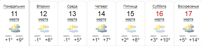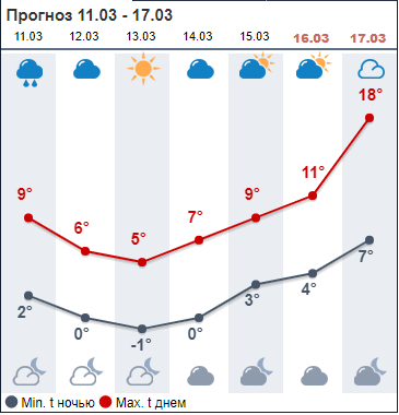 По данным сайта Sinoptik.ua, к выходным потеплеет до +10...+14. На неделе же средняя дневная температура: +5...+9. Осадки в виде дождя возможны в понедельник и субботу, 11 и 16 марта.