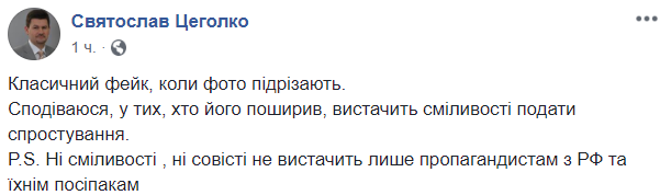 "Классический фейк, когда фото подрезают. Надеюсь, у тех, кто его распространил, хватит смелости дать опровержение", - написал он и опубликовал полную версию фото.