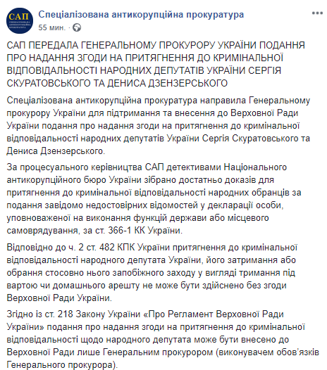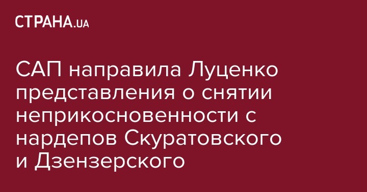 Специализированная антикоррупционная прокуратура (САП) направила генеральному прокурору Украины Юрию Луценко для поддержания и внесения в Верховную Раду представление о даче согласия на привлечение к уголовной ответственности нардепов Сергея Скуратовского (Радикальная партия Олега Ляшко) и Дениса Дзензерского (Народный фронт). Об этом ведомство сообщает на своей странице в соцсети.