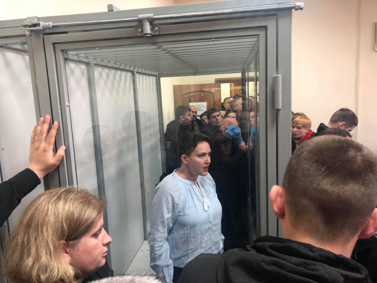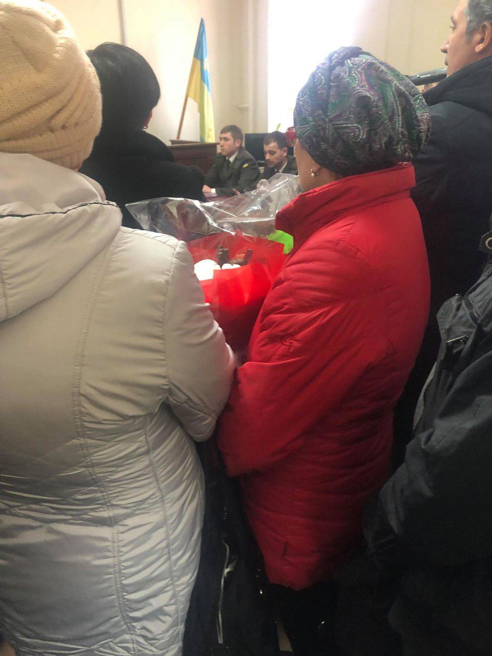 В зале заседаний собралось много людей, пожилая женщина принесла с собой букет из конфет. На столе перед прокурорами и адвокатами лежит медаль Героя Украины, принадлежащая Савченко. Ее адвокат Александр Шадрин подал ходатайство об отводе судей. По его словам, был изменен номер дела, чего быть не может: это вызывает подозрения в предвзятости суда.