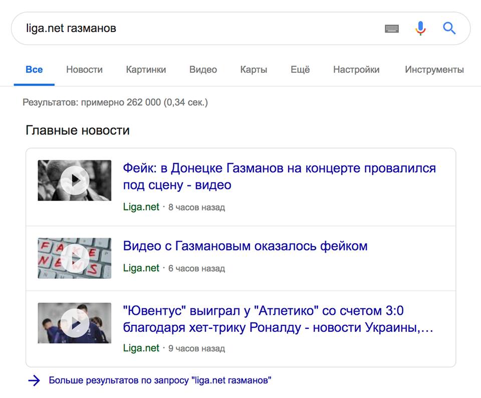 "1. Редакторы Лиги в погоне за трафиком дали новость одними из первых. "В Донецке Газманов на концерте провалился под сцену - видео". Плюс к оперативности, минус к фактчекингу.