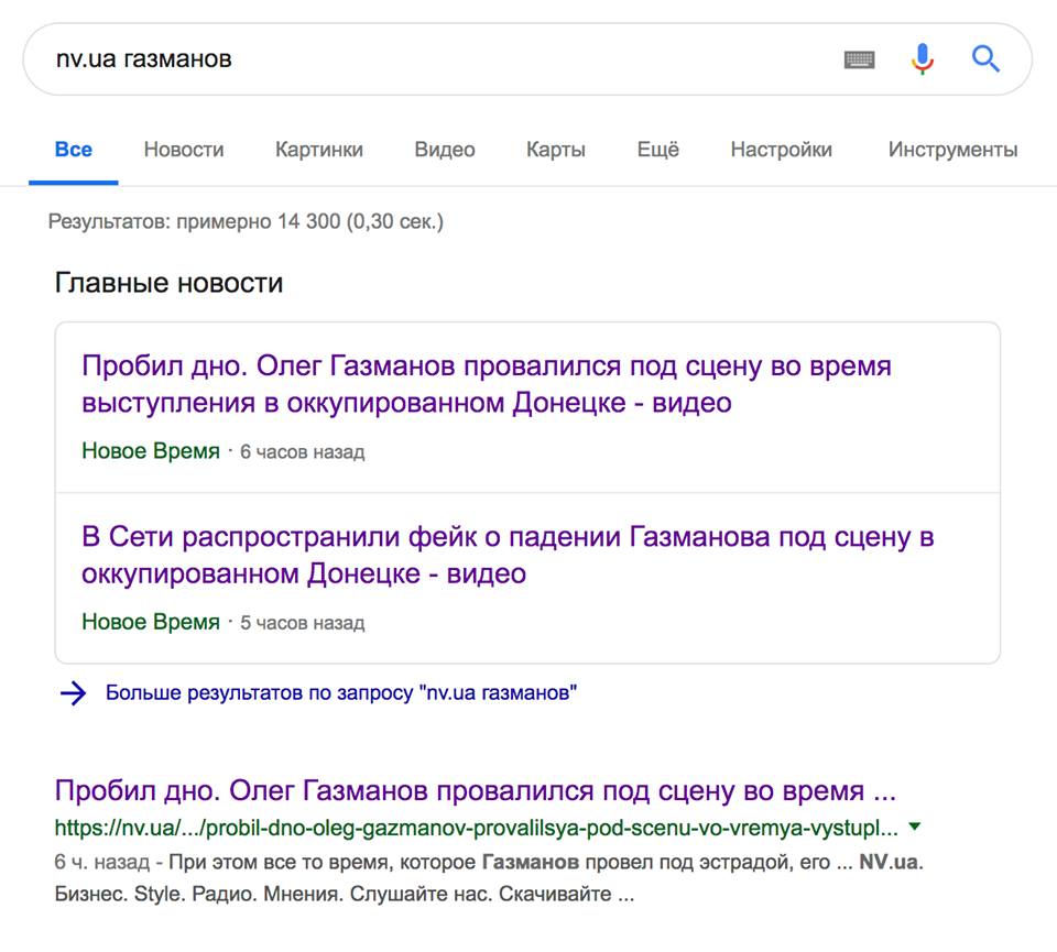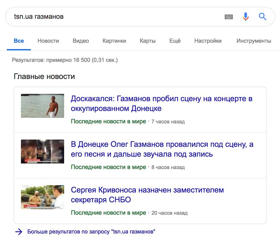 2. ТСНо опубликовали новость почти одновременно с Лигой. Причем, сразу в два раздела - Видео и Украина. "В Донецке Олег Газманов провалился под сцену, а его песня и дальше звучала под запись" и "Доскакался: Газманов пробил сцену на концерте в оккупированном Донецке". Но после того, как стало известно, что это неправда - просто удалили обе новости. Теперь по переходу из поиска там гордо висят "Страницы 404". (См. скрин 2)