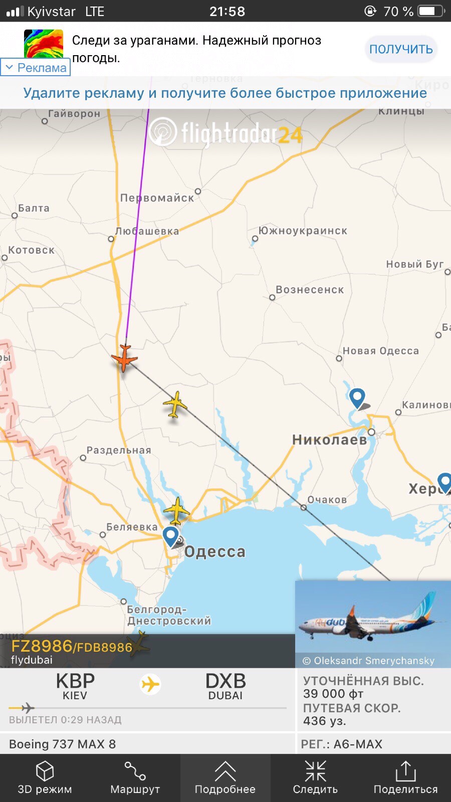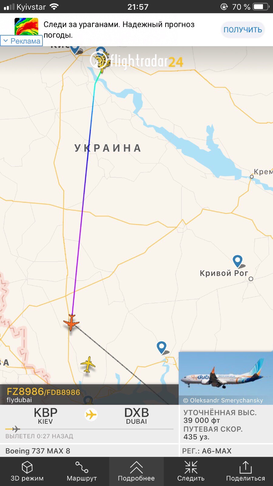Как видно на скриншотах, сделанных в приложении сервиса, рейс FZ8986 авиакомпании Flydubai вылетел из Киева в 21:30 в Дубай на самолете Boeing 737-8 MAX.