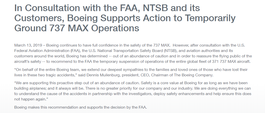 Авиастроительная корпорация Boeing не только поддержала решение решение властей США ввести временный запрет на полеты самолетов типа 737 MAX, но и порекомендовала Федеральному управлению гражданской авиации Соединенных Штатов Америки временно приостановить полеты всего мирового флота 737 MAX, в который входят 371 самолет, в связи с катастрофой в Эфиопии, которая случилась 10 марта. Об этом говорится в официальном заявлении компании.