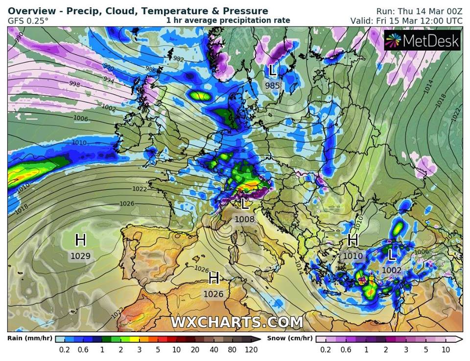 А уже в субботу, 16 марта, северный циклон с центром над Балтикой и его атмосферные фронты принесут в Украину осложнение погоды - дожди и сильный ветер. Только в восточных областях не будет дождей и ветра.