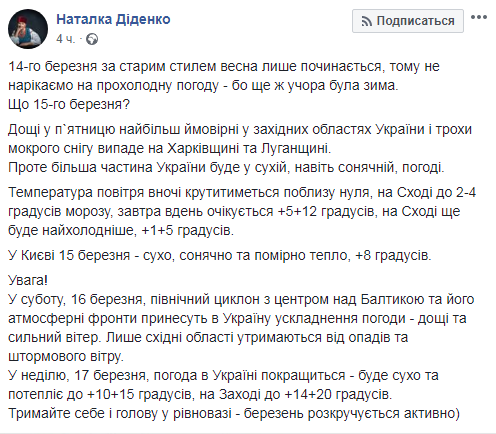 В пятницу, 15 марта, в западных регионах возможны дожди, а в Харьковской и Луганской областях - мокрый снег. Об этом сообщила синоптик Наталья Диденко на своей странице в Facebook.