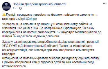 В одной из школ Днепра в четверг, 14 марта, на занятия не вышли 512 учеников. Около сотни из них пожаловались на плохое самочувствие, 12 школьников госпитализированы. Об этом сообщает полиция Днепропетровской области на своей странице в Facebook.