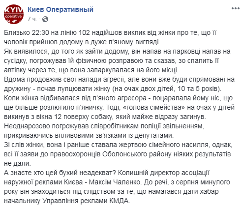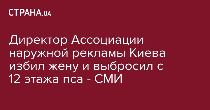 Директор Ассоциации наружной рекламы Киева Максим Чаленко в пьяном состоянии избил свою супругу. Также он решил выбросить из окна квартиры на 12 этаже свою собаку. Об этом говорится на Фейсбук-странице Киев Оперативный.