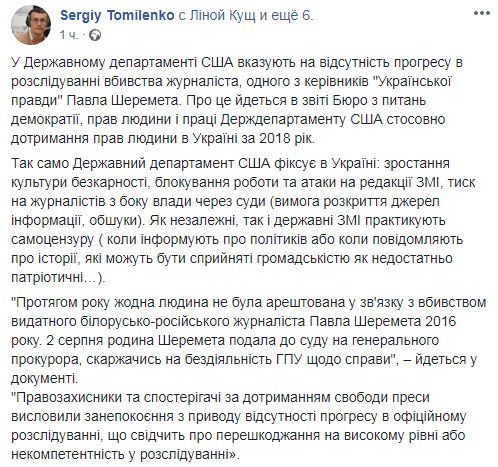 "Кейсы, изложенные в докладе Госдепартамента, Национальный союз журналистов Украины может существенно дополнить. Уже третий год подряд наши годовые отчеты по физическим атаках и отсутствия справедливости выходят под названием "Жертвы безнаказанности". Мы фиксируем отсутствие прогресса по расследованию дел избиений журналистов во времена Евромайдана, по нападениям на коллег из программы "Схемы", на фронтовую журналистку Наталью Нагорную, на десятки региональных работников СМИ. Не наказаны те, кто поджигал телеканал "Интер", кто в прямом эфире бил девушек с микрофонами...", - пишет Томиленко.