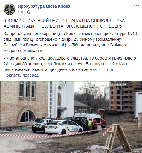 Киевская местная прокуратура №10 объявила о подозрении 25-летнему гражданину Армении, который напал на 46-летнего Александра Бухатого, работающего в администрации президента Украины. Об этом сообщает пресс-служба прокуратуры столицы в Facebook.