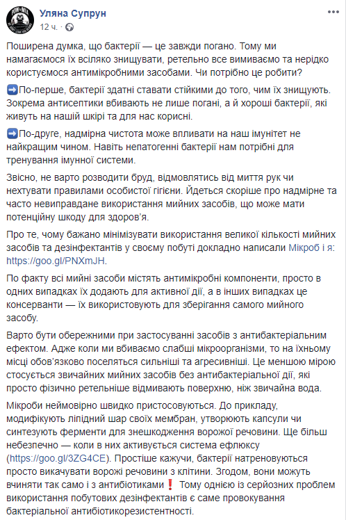 И.о. главы Минздрава Ульяна Супрун посоветовала украинцам осторожнее относиться к применению средств с антибактериальным эффектом.